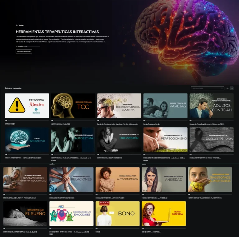 Con más de 18 módulos llenos de materiales ricos, tendrás todo lo que necesitas en un solo lugar, desde PDFs interactivos hasta juegos, abarcando temas como Ansiedad, Depressión, Autoestima, Pérdida y Duelo, Terapia de Pareja, Relaciones y muchos más.